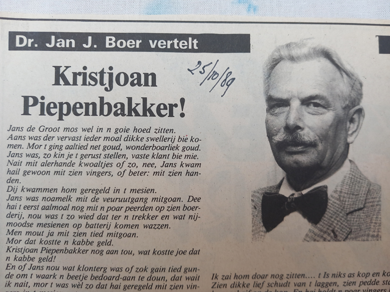 Jans de Groot mos wel in n goie hoed zitten. Aans was der vervast ieder moal dikke swellerij bie komen. Mor t ging aaltied net goud, wonderboarliek goud. Jans was, zo kin je t gerust stellen, vaste klant bie mie. Nait mit alerhande kwoaltjes of zo, nee, Jans kwam hail gewoon mit zien vingers, of […]