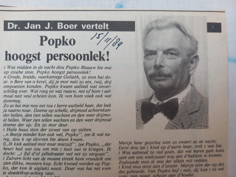 t Was midden in de nacht dou Popko Blaauw bie mie op stoebe ston. Popko hoogst persoonlek! n Grode, braide, vaarkantege Goliath, zo ston hai doar. n Bere van n kerel, dij je mor nait zo ain, twij, drij ompoesten konden. Popko kwam aaltied wat onverschilleg over. Wat roeg en wat raauw, net of hom […]