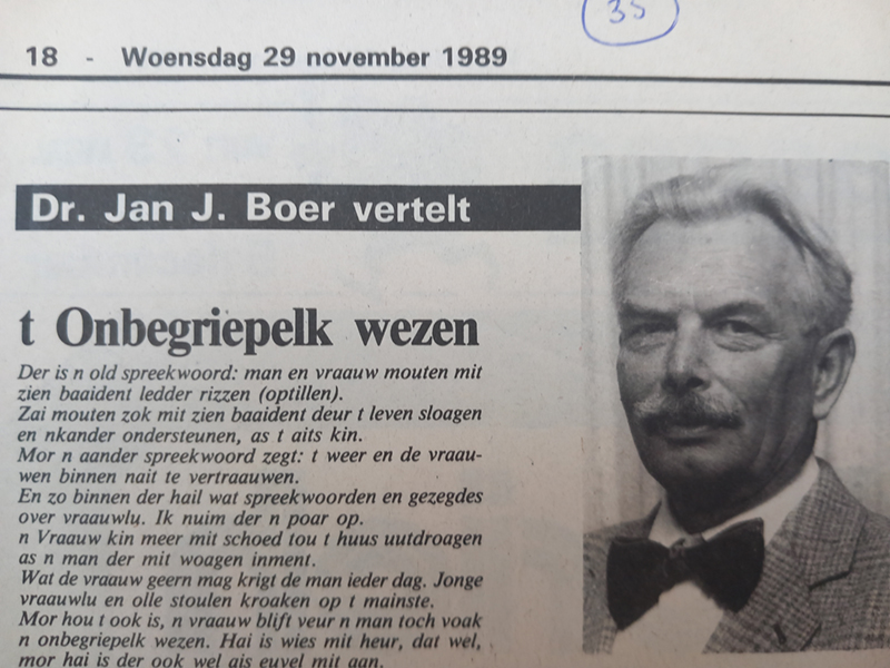Der is n old spreekwoord: man en vraauw mouten mit zien baaident ledder rizzen (optillen). Zai mouten zok mit zien baaident deur t leven sloagen en nkander ondersteunen, as t aits kin. Mor n aander spreekwoord zegt: t weer en de vraauwen binnen nait te vertraauwen. En zo binnen der hail wat spreekwoorden en gezegdes […]