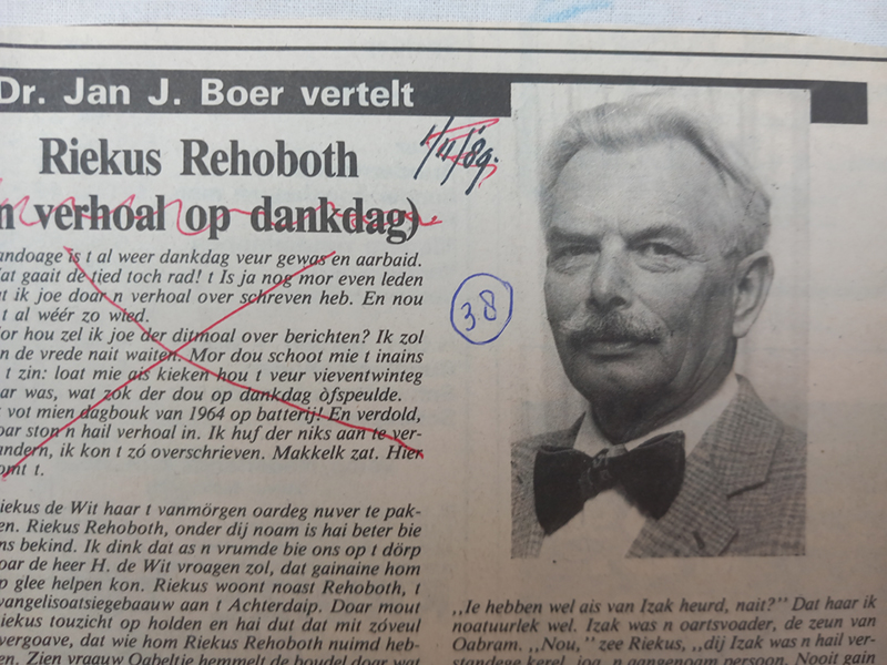 Riekus de Wit haar t vanmörgen oardeg nuver te pakken. Riekus Rehoboth, onder dij noam is hai beter bie ons bekind. Ik dink dat as n vrumde bie ons op t dorp noar de heer H. de Wit vroagen zol, dat gainaine hom op glee helpen kon. Riekus woont noast Rehoboth, t evangelisoatsiegebaauw aan t […]