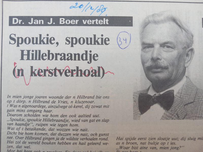 In mien jonge joaren woonde der n Hilbrand bie ons op t dorp, n Hilbrand de Vries, n kluzenoar. t Was n aigenoardege, ainzulvege ol-kerel, dij zowat mit gain mìns omgang haar. Doarom scholden wie hom den ook aaltied uut. “Spoukie, spoukie Hillebraandje, wied van gat en slap van haandje”, ruipen wie tegen hom. Wat […]